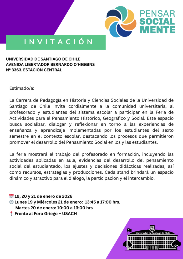 Desde el 19 al 21 de enero, el estudiantado de sexto semestre de la carrera de Pedagogía en Historia y Ciencias Sociales realizará la Feria de Pensamiento Social, espacio que busca socializar, dialogar y reflexionar en torno a las experiencias de enseñanza y aprendizaje implementadas en el contexto escolar, destacando los procesos que permitieron promover el desarrollo del pensamiento social en las y los estudiantes.